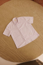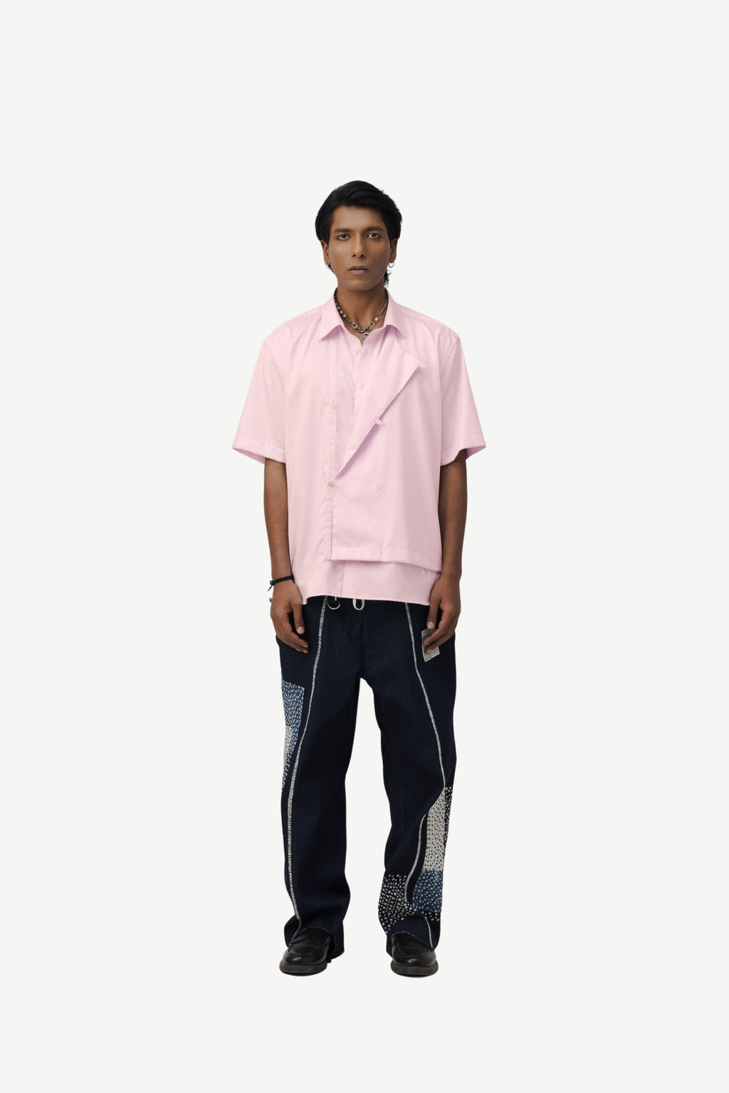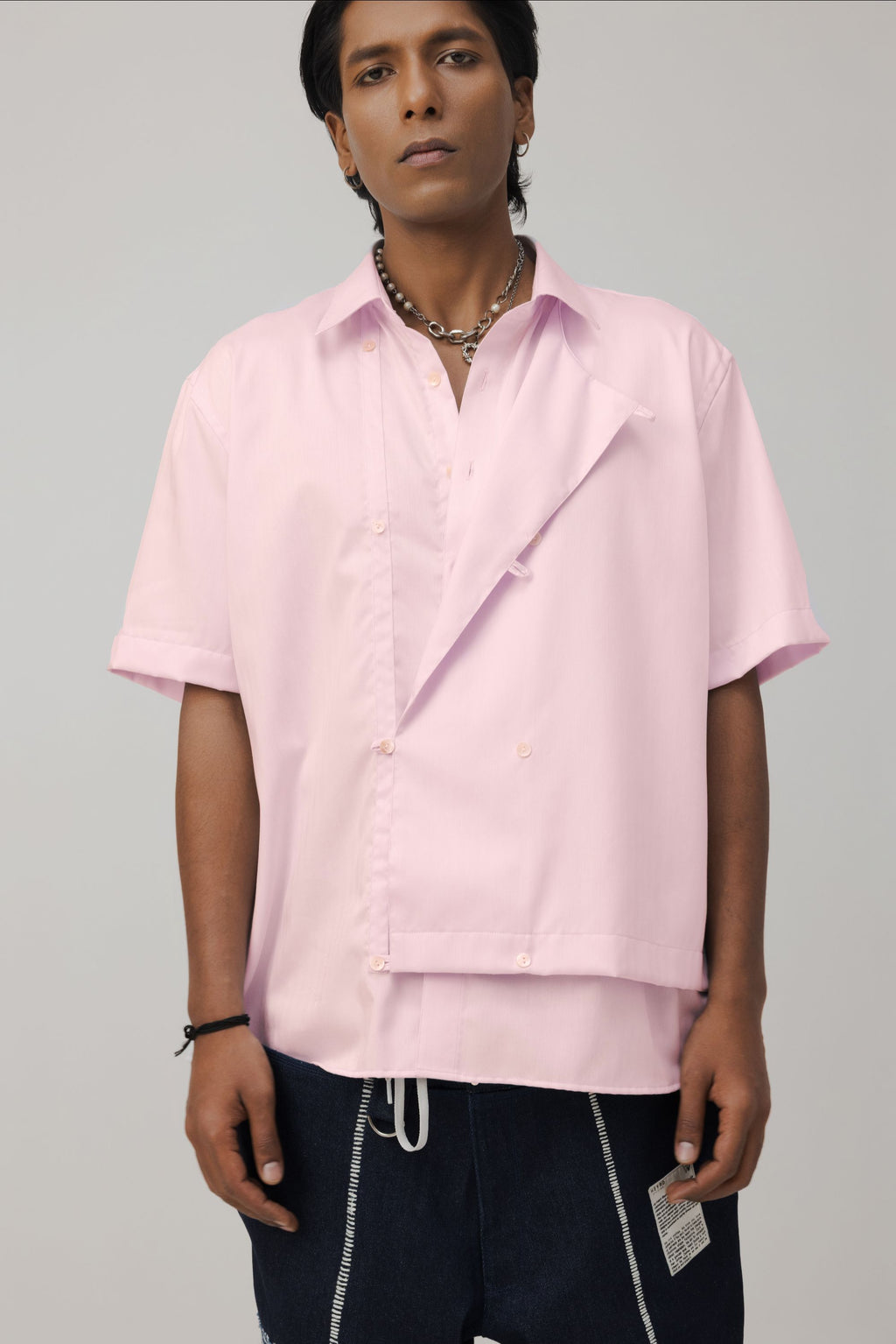 Design Notes: Constructed in cotton with an overlapping front panel that allows movement through the body. The structure adjusts rather than restricts. A hidden placket keeps the surface clean. Each detail serves a purpose. Built for long hours and consistent wear.